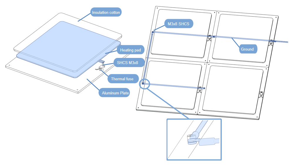 Use SHCS M3x8 to fix the thermal fuse to the heat bed;