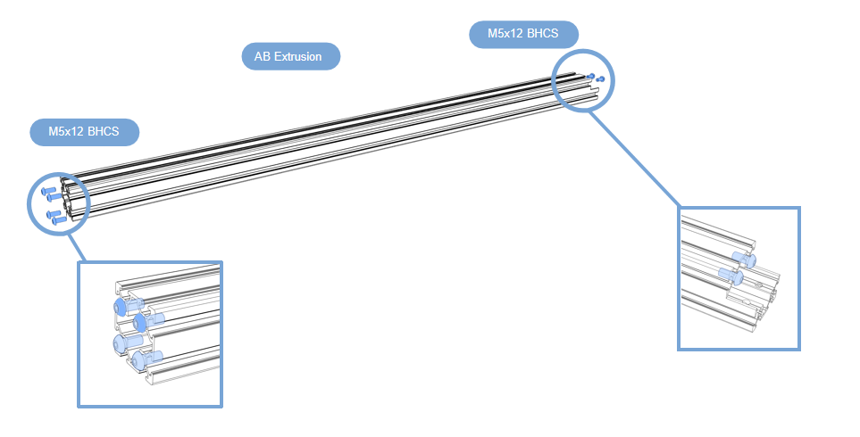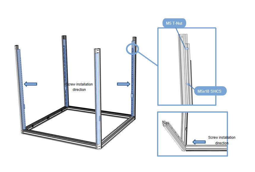 Prepare them as shown above, screw the 6Pcs M5x12 BHCS into the aluminum profile, do not tighten.