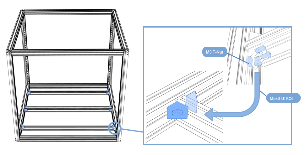 Use SHCS M3x8 and M3 T-Nut, install them on the rail at intervals, and do not tighten the M3 T-Nut