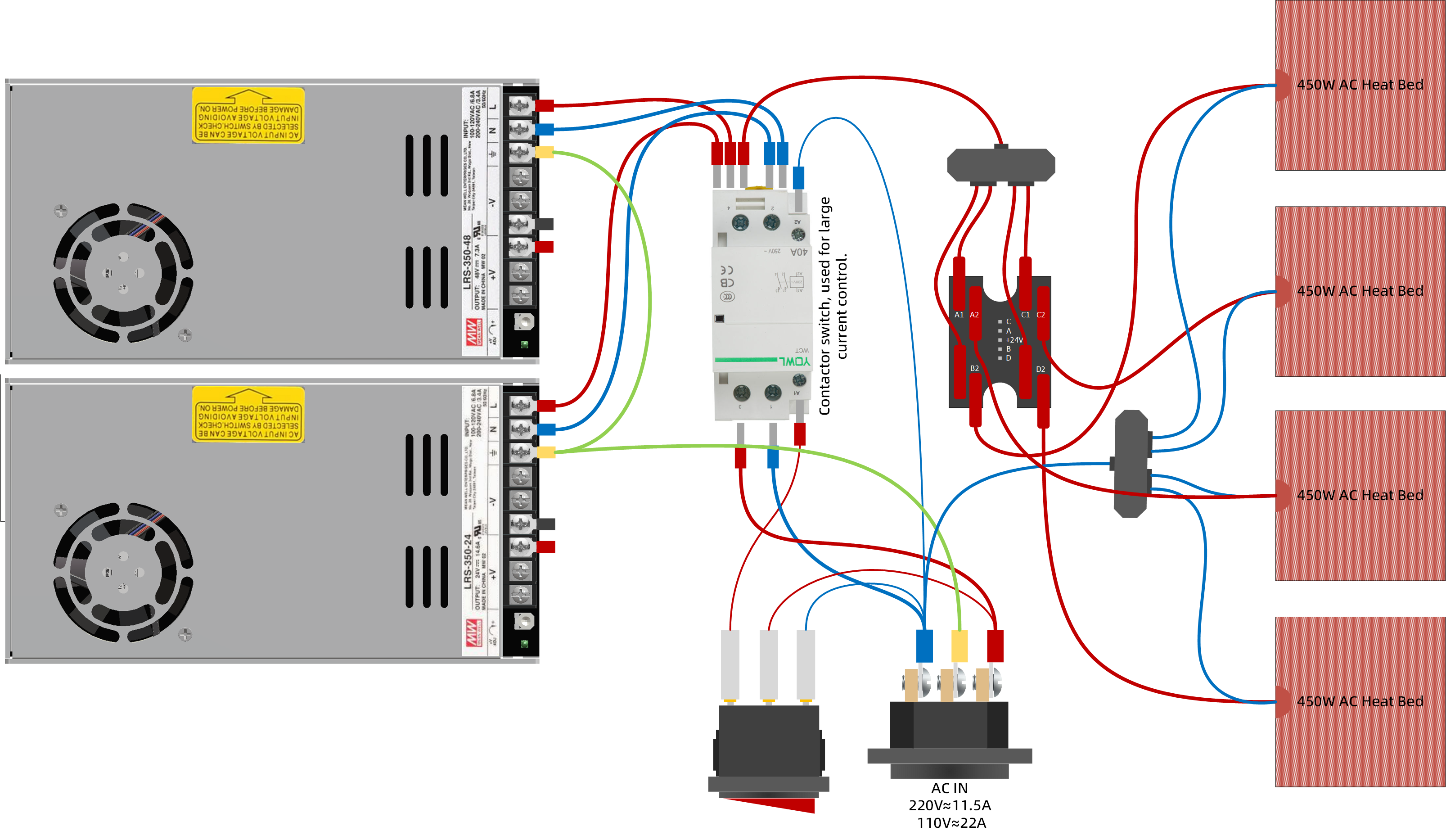 When the printer leaves the factory, most of the AC and DC connections have been connected. You only need to connect the hot bed, motor and other peripherals to use it. If you need to repair or modify, please refer to the following diagram: