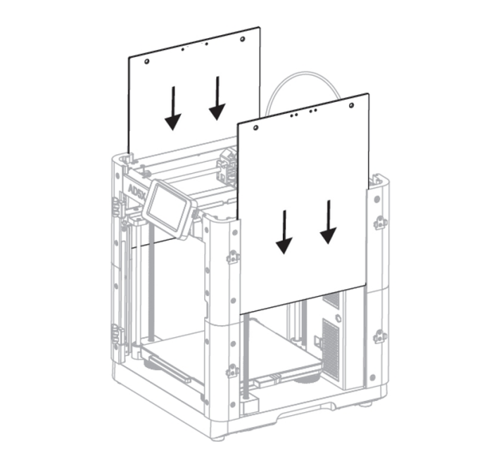 Slide the three top acrylic side plates into the front, rear, and left slots until they reach the bottom.