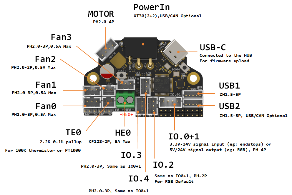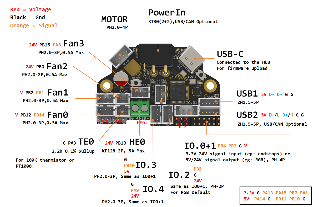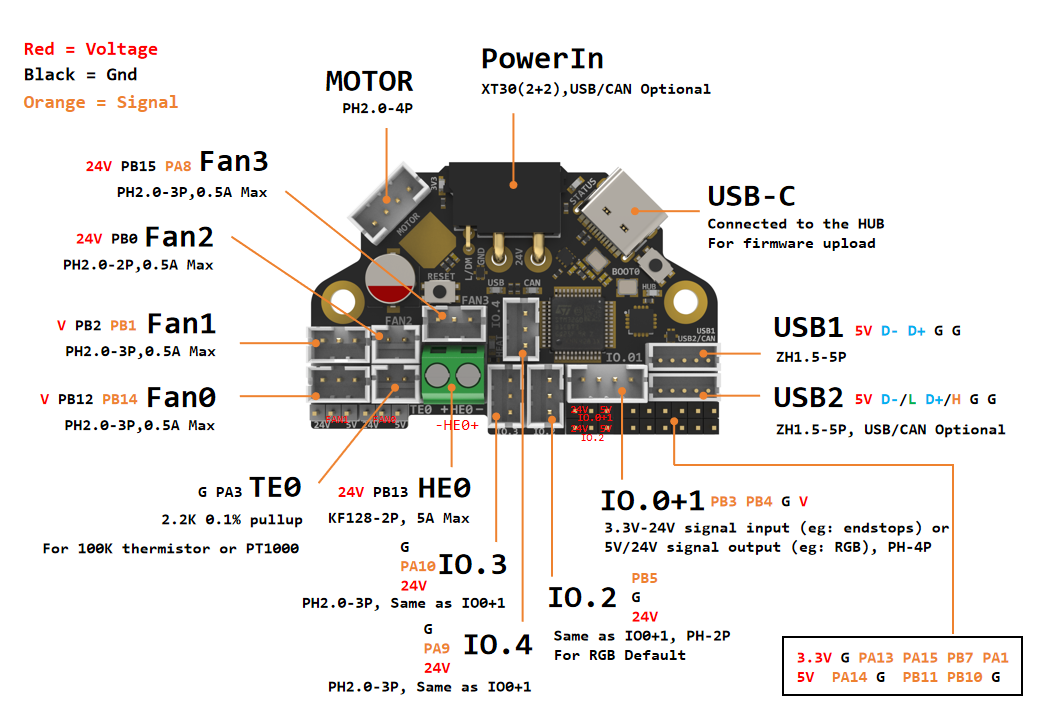 | IO.4/RGB1 | PA9 | 5V Digital Output, 24V power supply default, For 24V WS2812/SK6812 RGB/Servo (Pad voltage selector) |