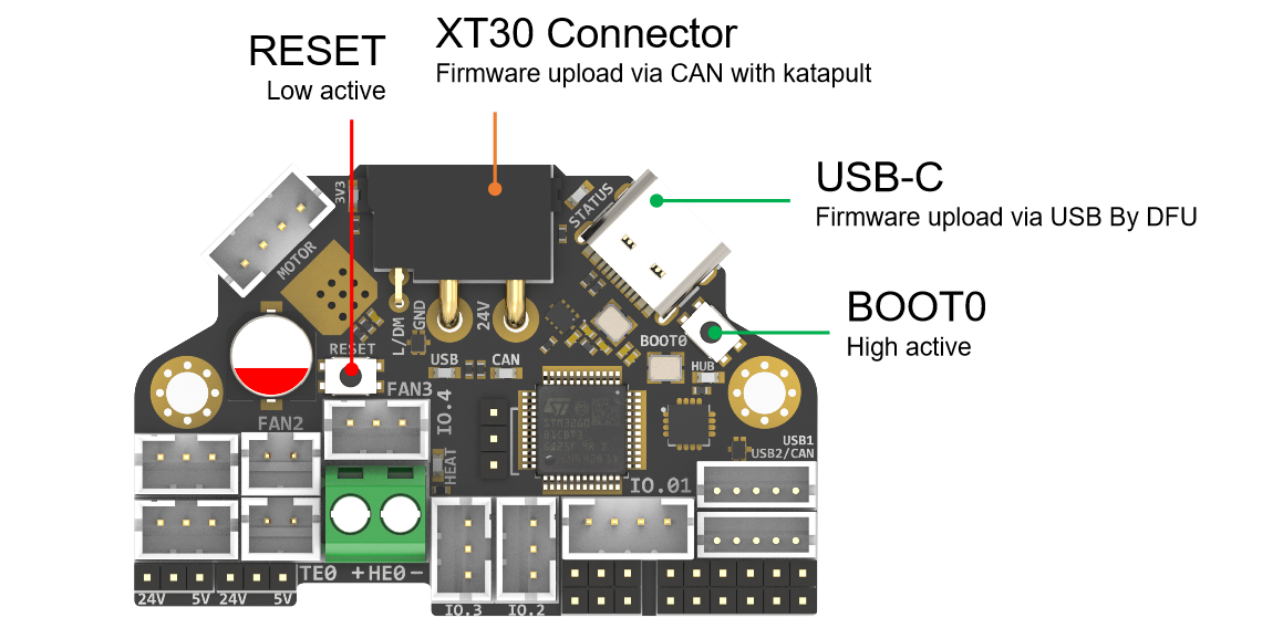 | STATUS | When using katakulpt- Blinking: Entering download mode;Off/Always on: Not in download mode, the status is generally determined by config; The LED is controlled by PC13 and lights up at a high level. For customized usage, please refer to julianschill/klipper-led_effect |