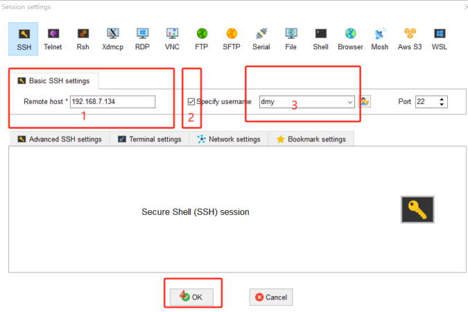3.In the dialog box that is displayed,enter the IP address of the Raspberry Pi,select the specified user name,enter the user name,and click ‘ok’