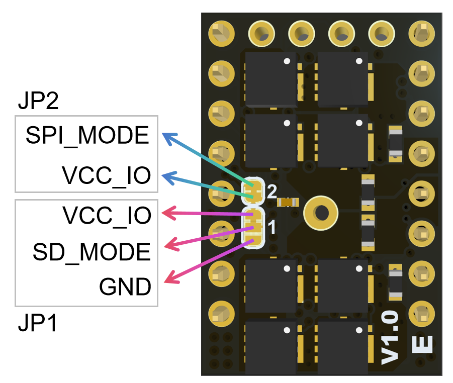 JP1 is used to set SD_MODE. The default connection is with VCC_IO, which is high level. You can use a knife to cut the existing connection to set SD_MODE to low level.