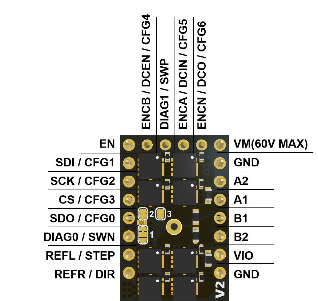 | DIAG0 | Diagnostics output DIAG0. Interrupt or STEP output for motion controller (SD_MODE=0, SPI_MODE=1). Use external pullup resistor with 47k or less in open drain mode. Single wire I/O (negative) (only with SD_MODE=0 and SPI_MODE=0) |