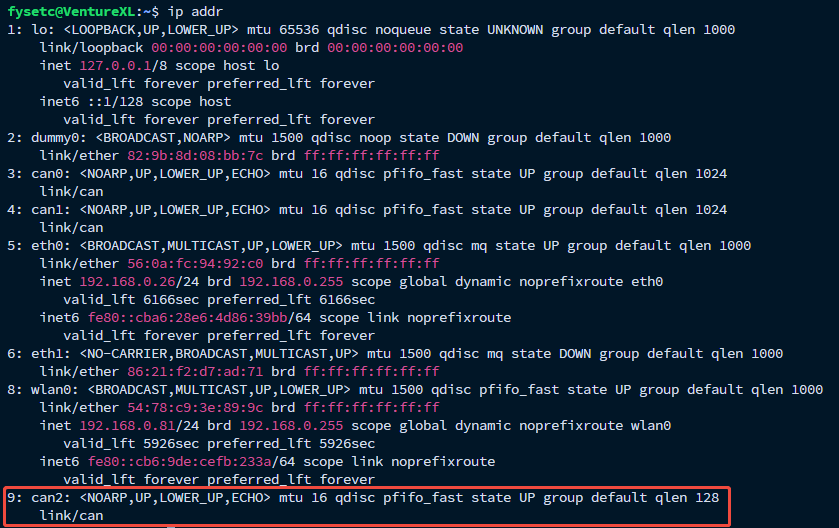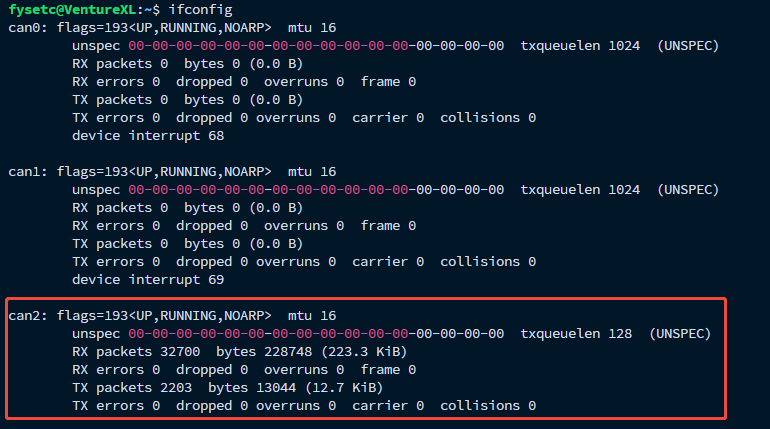 If it is consistent with the above figure, you need to confirm again whether canbus_uuid is configured correctly (we have configured uuid at the factory, but it is still worth checking this option to avoid negligence). The CAN interface here is provided by Spider_Pro's USB to CAN Bridge mode, which should be CAN2. Use ifconfig or ip addr to confirm whether CAN2 appears.